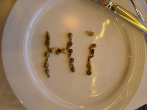 It is really amazing what you can do with grape seeds. Joe first used them to leave a message for our server for dinner, then he later used them to build a model replica of the Statue of Liberty. |