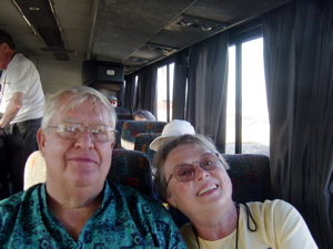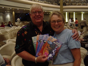 When most people win things, they get excited. When Joe discovered that he had the winning ticket, he calmly stood up and said, "I think I've got it." He & Ellie get to take up to a 15-day cruise sometime within the next year. Here they are with cruise brochures trying to narrow down where to go on their free cruise. The winning ticket is in Joe's right hand with the brochures. Appearantly, no thought has been put into taking either of us, or giving us the cruise outright. They are now out of our will. |